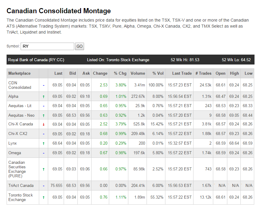 In Canada, there are alternative trading marketplaces that allow Canadian companies to trade on more than the TSX and TSX-V. The Canadian Consolidated Montage display the trading activity in all marketplaces for equities listed on the TSX, TSX-V and one or more of the Canadian ATS (Alternative Trading System) markets: TSX, TSXV, Pure, Alpha, Omega, Chi-X Canada, CX2, and TMX Select as well as TriAct, Liquidnet and Instinet.