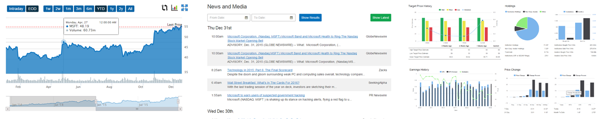 Our IR tools and widgets provide dynamic, attractive and useful information content to investors and site visitors, including Stock Quotes, Company News, Charts, SEC Filings, Insider Reports, Historic Quotes, Market Depth Data (bid, ask, Level 2), Institutional Holdings and more.